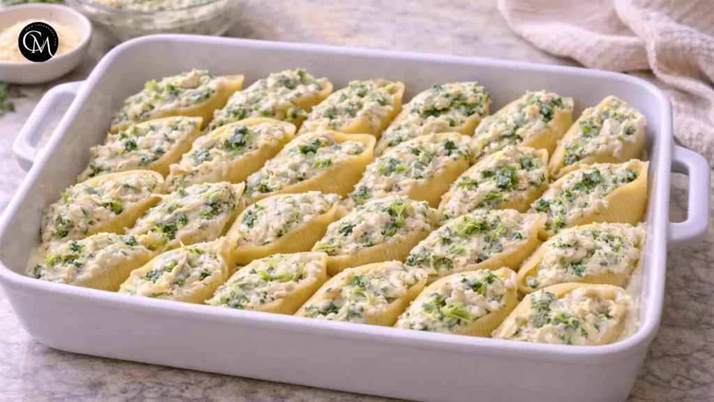 Spoon the chicken-broccoli filling into each shell, packing them generously. Place stuffed shells snugly in the baking dish.