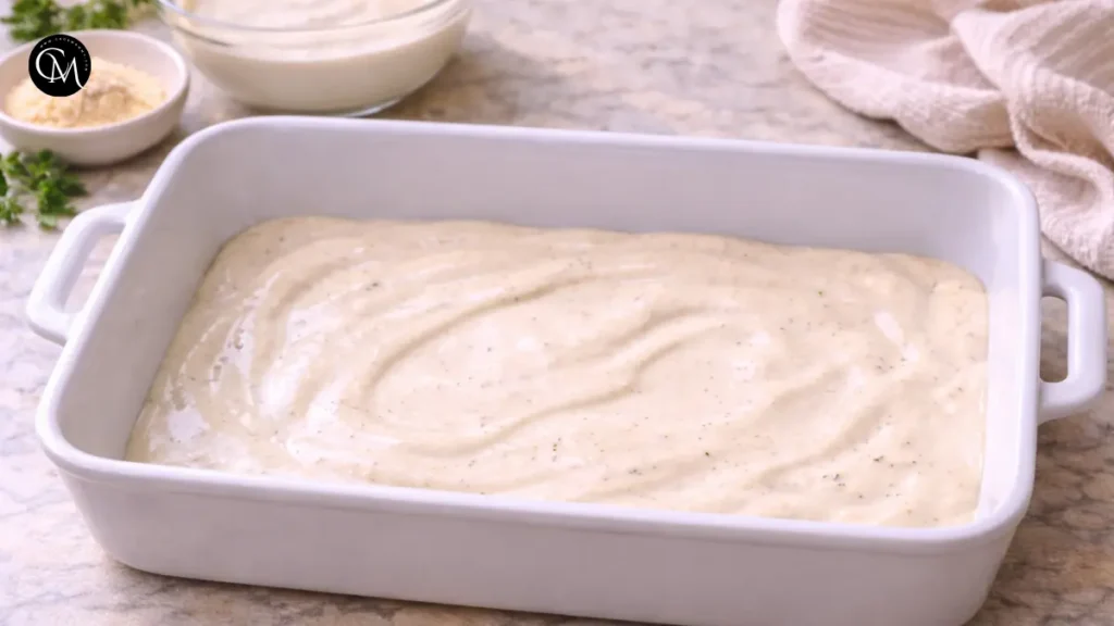 Spread 1 cup of Alfredo sauce evenly on the bottom of a greased 9×13-inch baking dish. This prevents sticking and infuses flavor from the first bite.