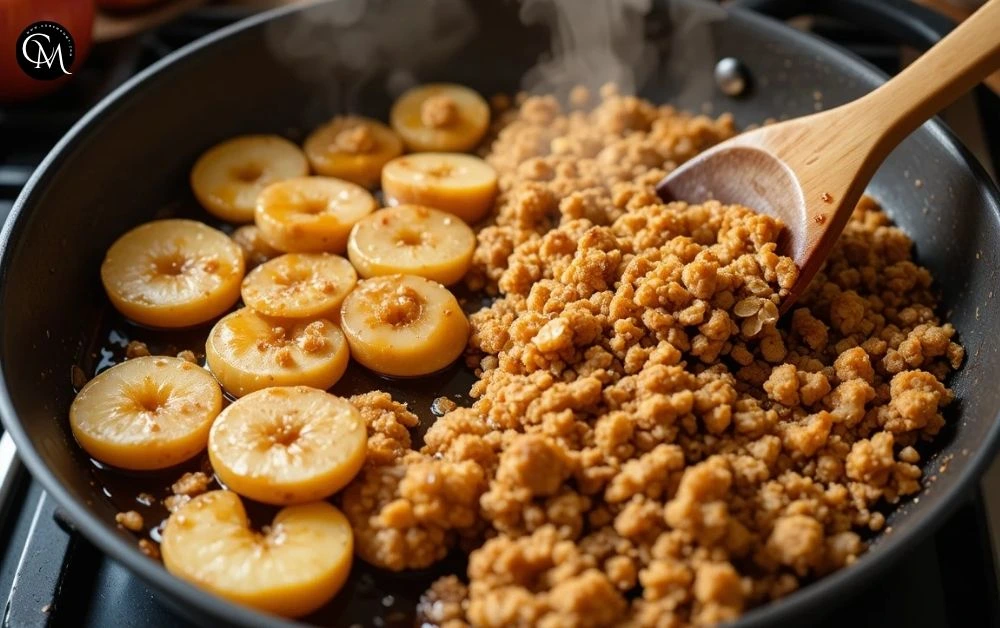 Push the apples to one side of the pan and add the oat mixture. Toast for 2–3 minutes, stirring gently until golden and fragrant. This creates that signature crunchy topping every apple crisp needs.