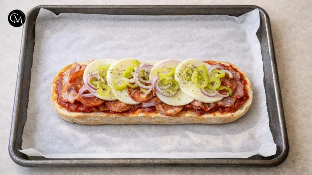 Place the bottom half of the loaf on the baking sheet. Spread marinara sauce evenly. Layer meats , pepperoni then add cheese slices and any optional veggies.