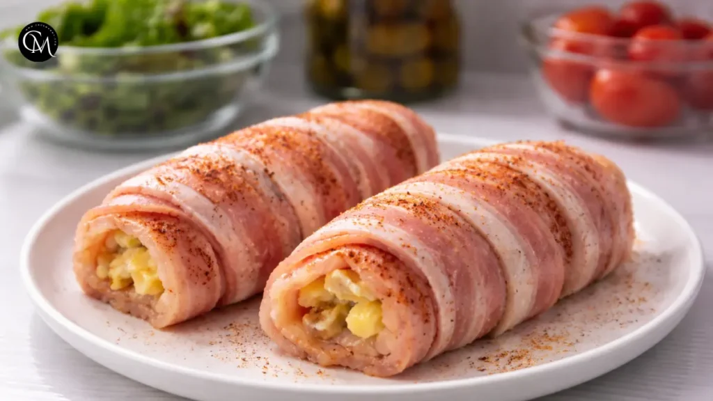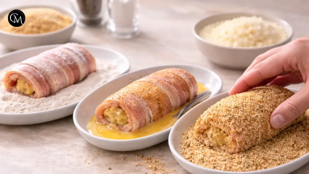 Once you’ve rolled the chicken with slices bacon and cheese inside, chill for 15 minutes in the fridge. This firms up the shape and keeps fillings in place.