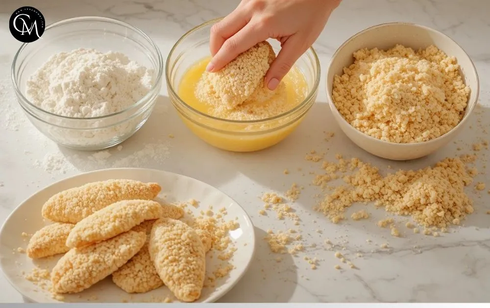 Dip each piece first in flour, then in egg, and finally coat with breadcrumbs. Press gently so the crust adheres and stays crisp during frying.