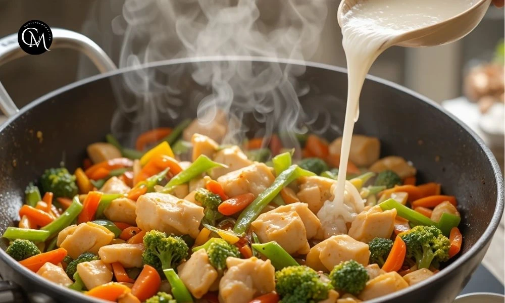 Add your vegetables and stir for 2–3 minutes. Add the cornstarch slurry if you prefer a thicker sauce.
