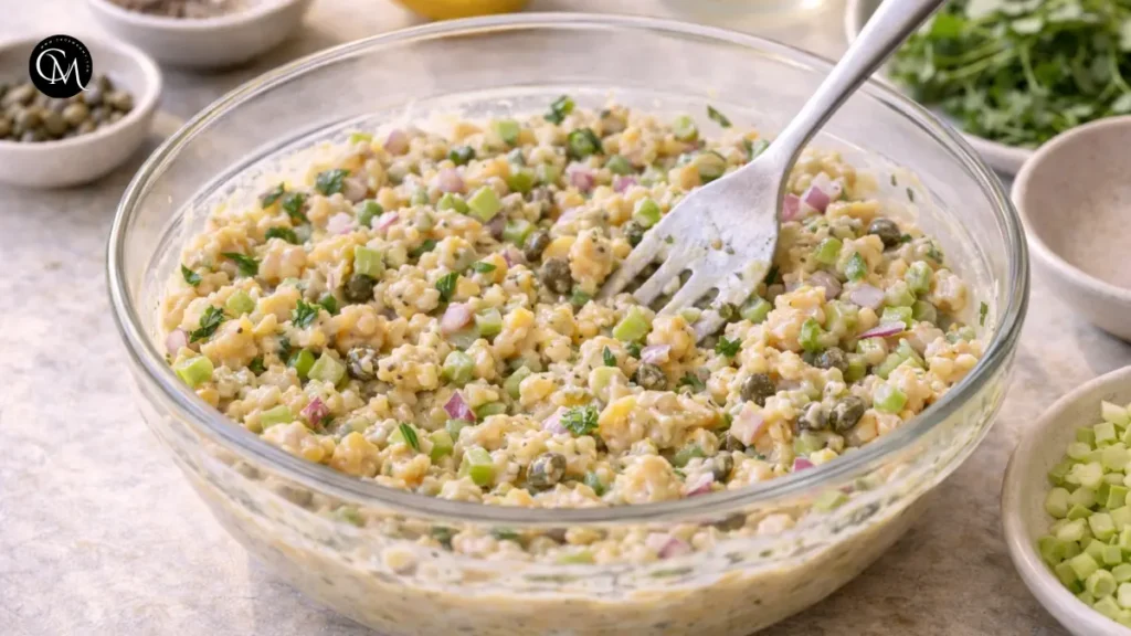 Fold in chopped celery, onion, and any optional ingredients like capers or spices. Mix well.