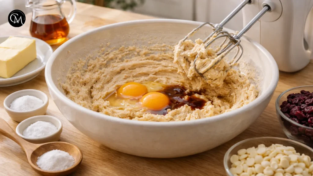 This is where the flavor base begins. Creaming butter and sugar is not just about blending. It also traps a little air, which helps create a softer cookie. Brown sugar brings a deeper, caramel-like taste and helps keep the centers chewy. Vanilla rounds everything out and makes the white chocolate taste fuller.