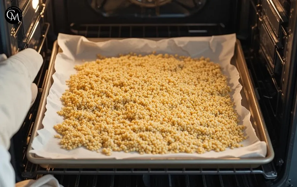 Preheat your oven to 350°F (180°C). Spread the cooked quinoa evenly on a parchment-lined tray. Bake for 10–12 minutes until light golden and crisp. This toasting step is the foundation of that signature crunch.