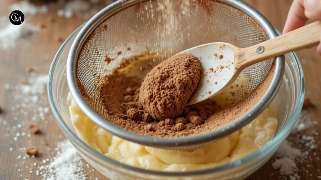 Sift the flour, cocoa, and salt, then fold them into the egg mixture using slow, sweeping motions.