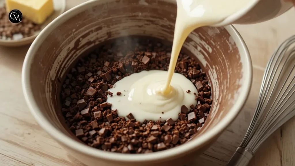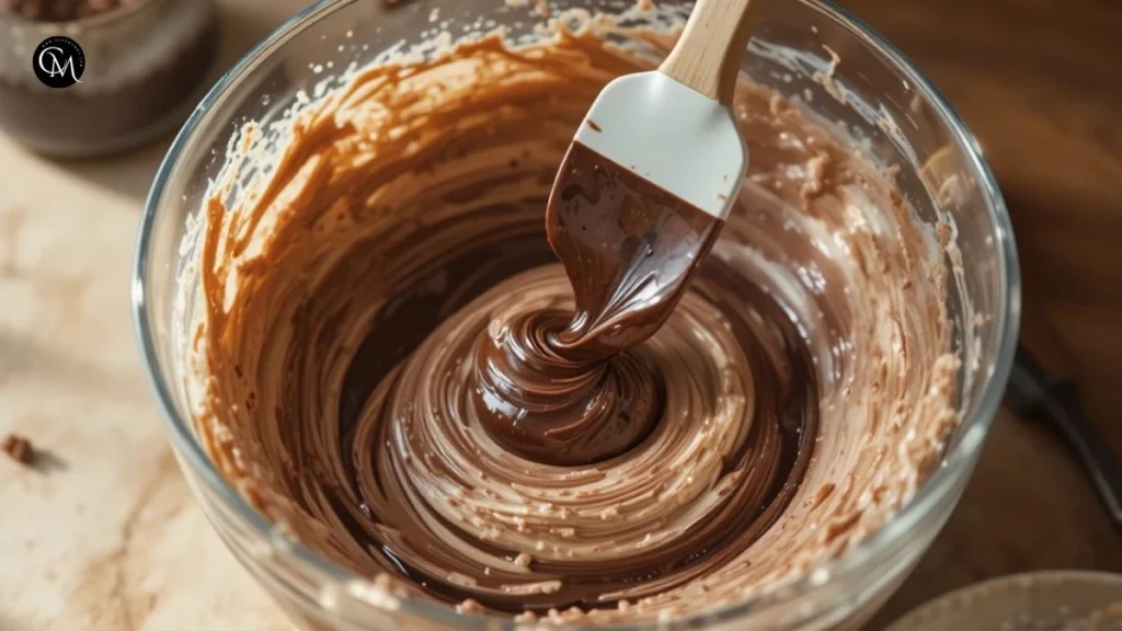 Whip the heavy cream with cocoa, powdered sugar, and vanilla, then fold in the cooled melted chocolate.