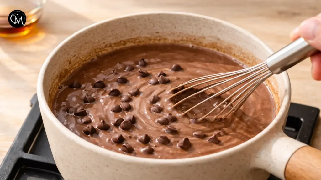 Add chocolate chips and stir until fully melted. This step gives your Chocolet Ice Creem its luxurious mouthfeel.
