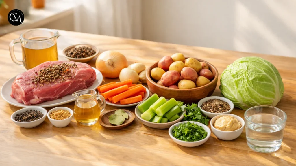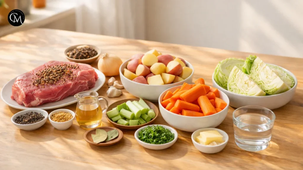 The beauty of Corned Beef with Cabbage is that the ingredient list is simple, but each ingredient contributes something important. The beef brings salt and richness, the cabbage adds sweetness, and the root vegetables soak up the seasoned broth beautifully.