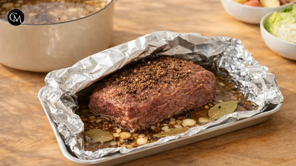 Once tender, lift the corned beef onto a tray and loosely cover it with foil. Letting it rest before slicing helps the juices settle and keeps the slices neat.