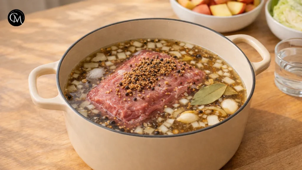 This stage is where the cooking science starts helping you. The aromatics infuse the liquid as it heats, creating a seasoned broth that gently flavors both the beef and the vegetables. The splash of vinegar does not make the dish sour. Instead, it brightens the broth and helps balance the richness of the brisket. A well-built cooking liquid is what separates bland Corned Beef with Cabbage from a version with real depth.