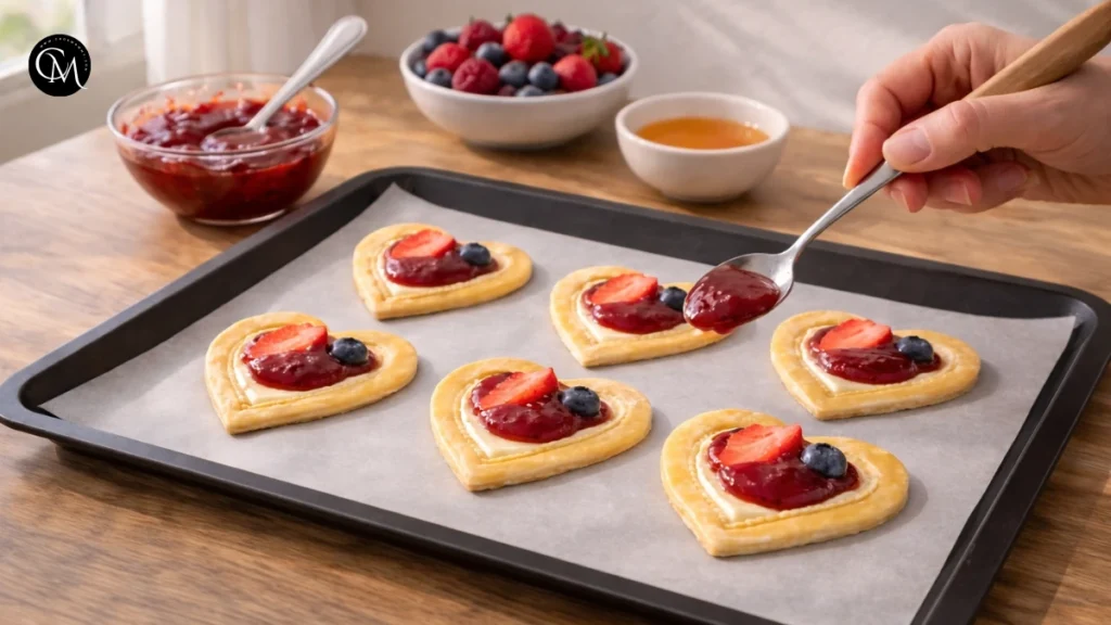 Place the shaped pastry hearts on the prepared tray, spacing them slightly apart. Spoon about 1–2 teaspoons of filling into the center of each heart. Spread gently, keeping the edges clean so they rise properly. If the filling reaches the border, it may leak during baking and prevent the pastry from puffing evenly.