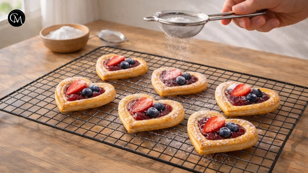 Let the danishes cool on the tray for about 5 minutes, then transfer to a wire rack. This prevents condensation underneath and keeps the bottoms crisp. Once slightly warm (not hot), dust lightly with powdered sugar or drizzle icing. Cooling allows the filling to firm up, giving the danishes their ideal texture and clean bite.