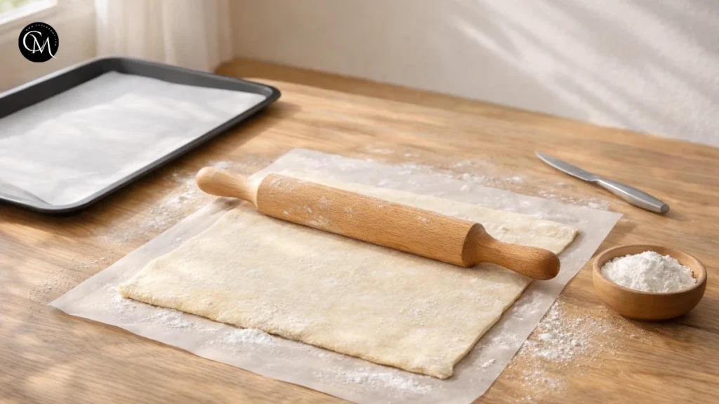 Preheat your oven to 190°C (375°F) and line a baking tray with parchment paper to prevent sticking and ensure even browning. Remove the puff pastry from the fridge only when ready to use cold dough is essential for flaky layers. Lightly roll it out on a floured surface just enough to smooth cracks and even the thickness. Avoid over-rolling, as this compresses the layers and reduces puff. If the pastry becomes soft or sticky, return it to the fridge for 5 minutes before continuing.