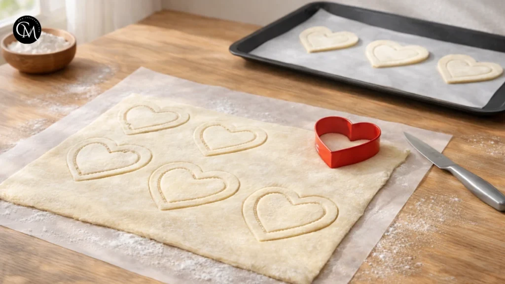 Use a heart-shaped cutter (or a sharp knife) to cut even shapes. For each heart, gently score or cut a smaller heart inside, leaving about a 1 cm border around the edges. Do not cut all the way through the base layer this border helps the pastry rise around the filling and keeps the center defined. For a more dimensional look, lightly press the inner shape with a fork instead of cutting it fully.