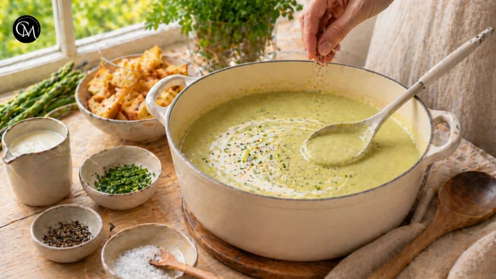 Add salt, black pepper, and lemon juice. Taste carefully and adjust. Sometimes the soup needs more salt than expected, especially if you used low-sodium broth. A little lemon juice does not make it sour; it wakes up the asparagus flavor and keeps the cream from tasting too heavy.