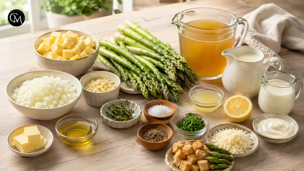 - Optional garnish: croutons, grated Parmesan, cream swirl, fresh chives, or asparagus tips