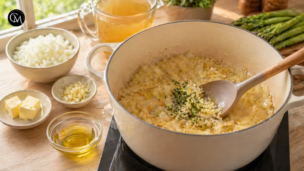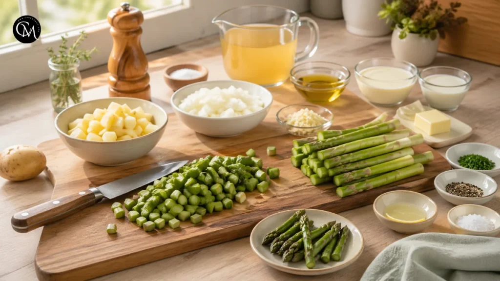 Preparation matters more than people think. Even cuts help the vegetables cook evenly, which means smoother blending later. Dicing the potato small also helps it soften at the same pace as the asparagus. This is one of the first secrets behind consistently good Creamy asparagus soup: organized prep prevents rushed cooking.
