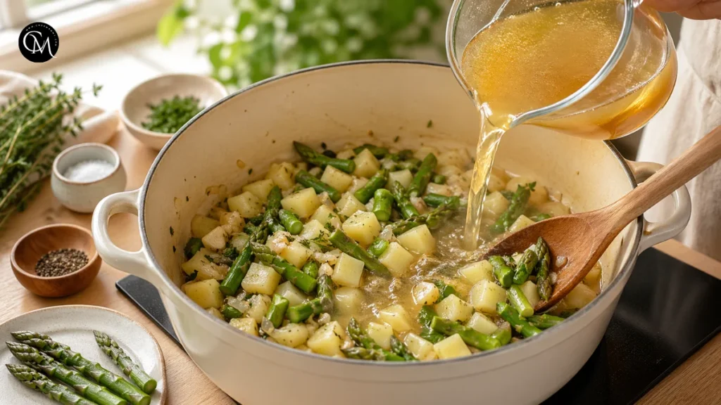 Add the diced potato and chopped asparagus to the pot. Stir for 2 minutes so the vegetables coat lightly in the fat and aromatics. Then pour in the broth and bring everything to a gentle boil. Reduce to a simmer and cook for 15 to 18 minutes, or until the potato is tender and the asparagus is just soft.