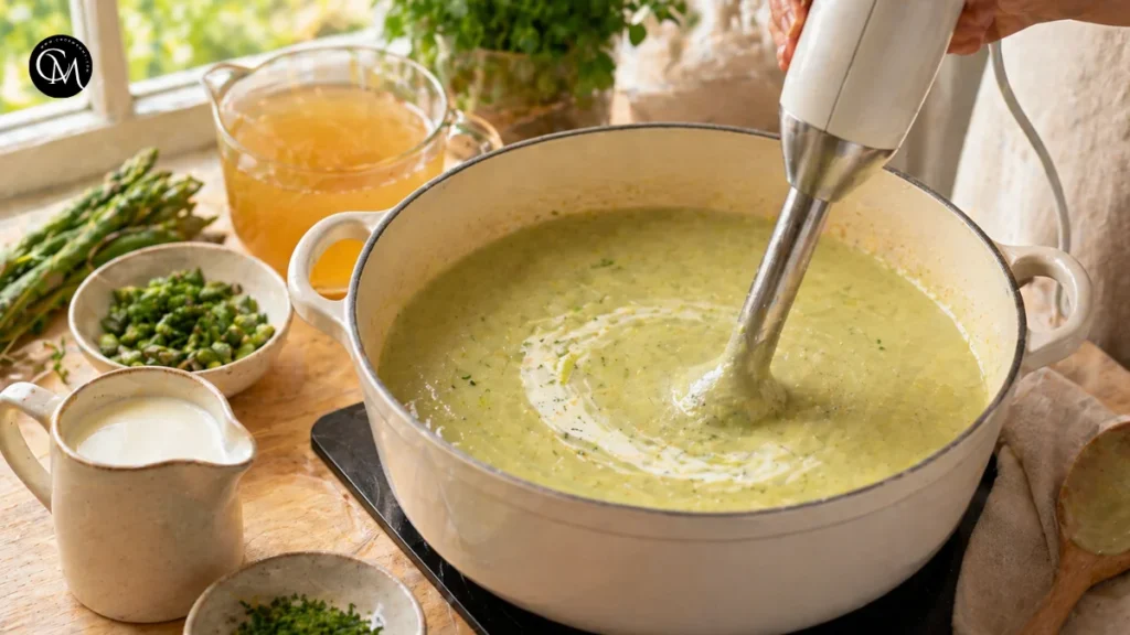 Do not overcook the asparagus. That is one of the biggest texture and flavor mistakes. Asparagus loses its bright taste and vivid color when it cooks too long. For the best Creamy asparagus soup, you want the stalks tender enough to blend, but still fresh-tasting. If using the reserved asparagus tips, blanch them separately for 2 to 3 minutes and save them for garnish.