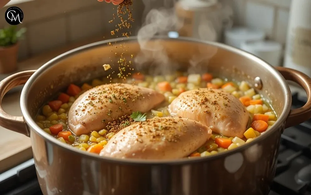 Place chicken breasts or thighs in the pot. Sprinkle in thyme, add the bay leaf, and season with salt and pepper. Stir gently to coat the chicken with aromatics and spices.