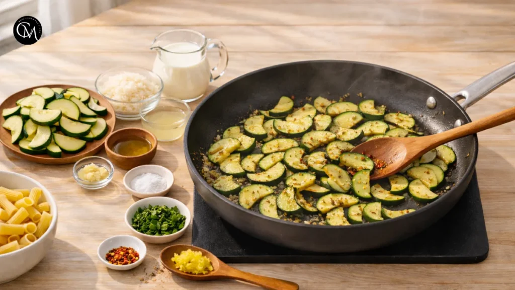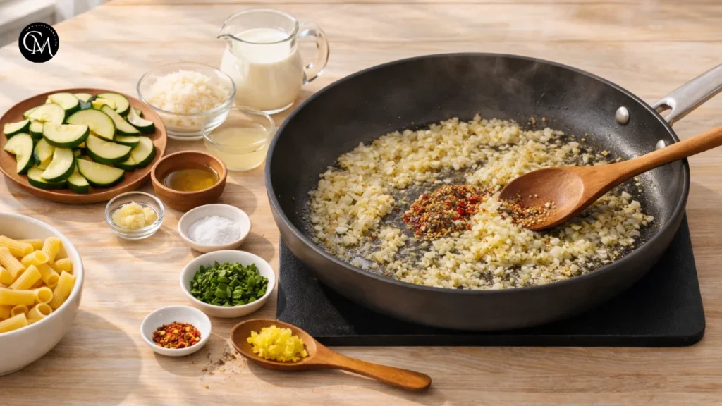 This step is where the flavor really starts. Onion brings sweetness, garlic adds warmth, and fat helps carry those aromas through the whole dish. Do not rush it. If you cook the onion until it is only barely soft, the final sauce can taste flat. A little color here gives Creamy Pasta with Zucchini a deeper, more savory base.