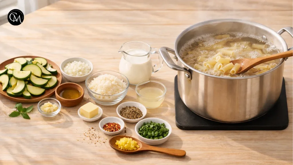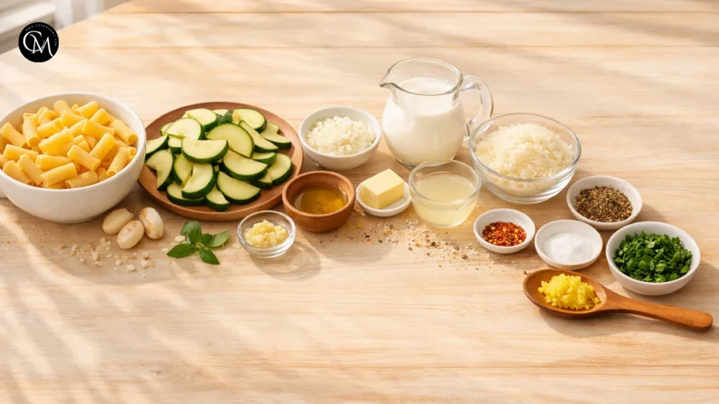 The beauty of Creamy Pasta with Zucchini is that it tastes rich without needing a long ingredient list. Each item has a job: zucchini adds softness, garlic and onion build depth, cream smooths everything out, and Parmesan ties the sauce together.