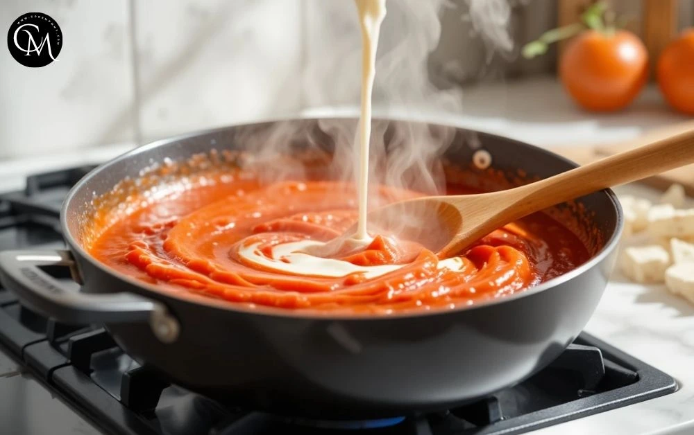 Lower the heat and stir in the cream until the sauce turns a smooth pink. Keep stirring to prevent curdling.