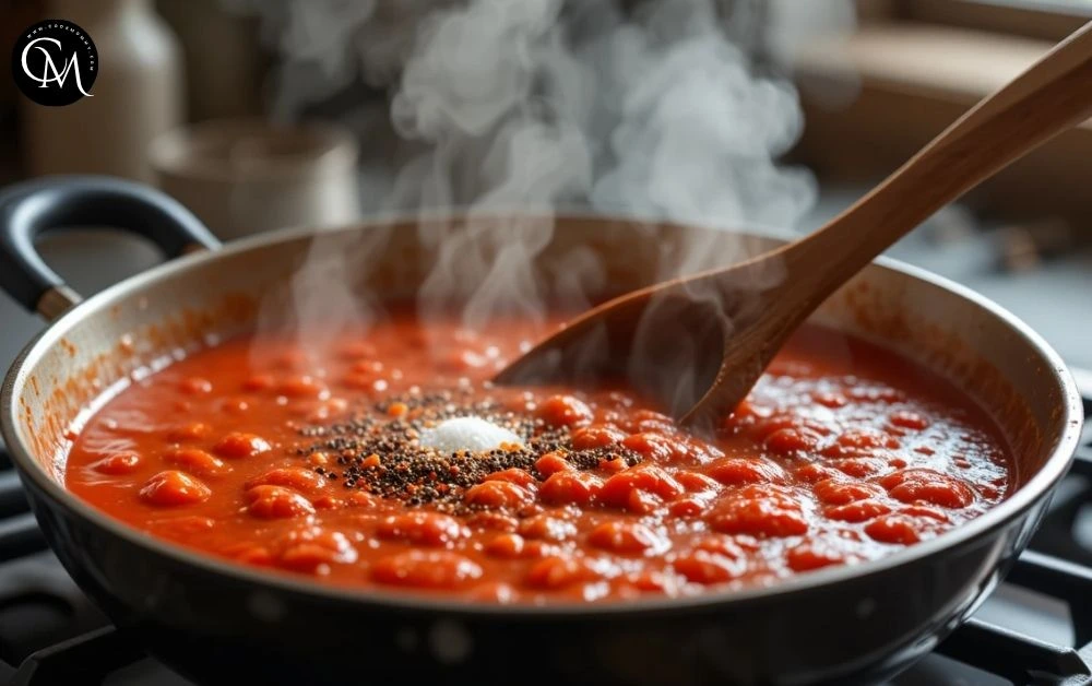 Stir in tomato puree, chili flakes, salt, and pepper. Simmer for about 5 minutes until slightly thickened.