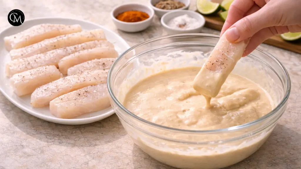 Pat fish dry and cut into taco-sized strips. Sprinkle the fish with a little salt and pepper before dipping each piece in the prepared mixture.