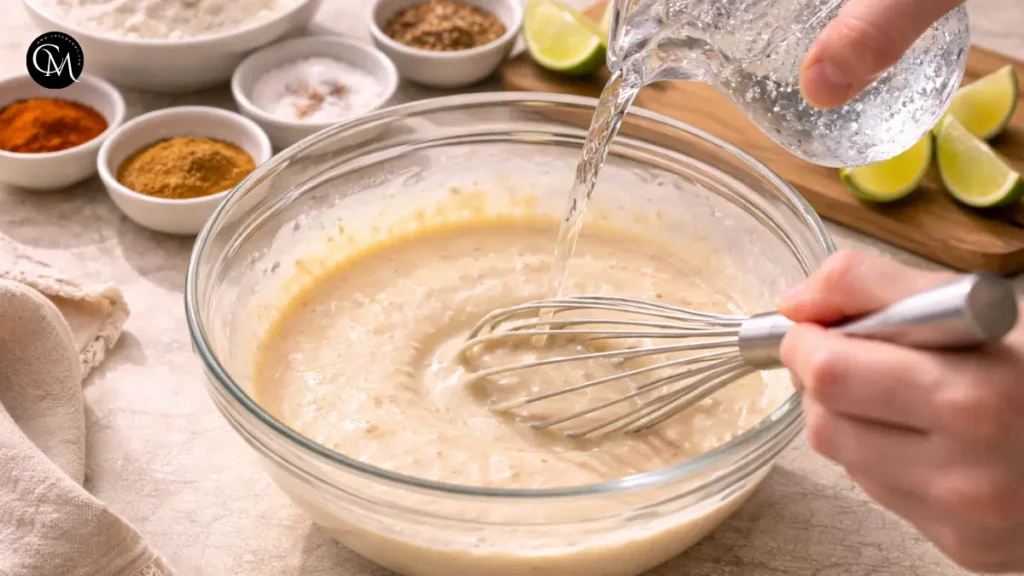 Place the flour, cornstarch, baking powder, and seasoning in a bowl and mix well. Slowly stir in the sparkling water until the batter is smooth and thick, like pancake batter.