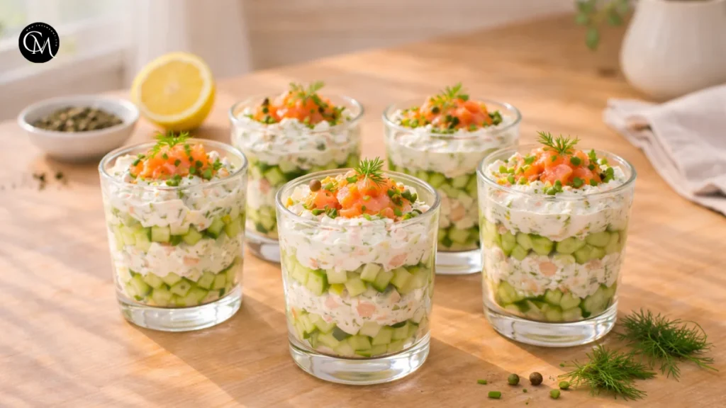 cucumber and salmon verrines prove that an impressive appetizer does not need to be complicated. With crisp cucumber, creamy seasoned filling, and delicate smoked salmon, this recipe delivers freshness, contrast, and a polished look in just a few simple steps. It is quick enough for everyday entertaining but elegant enough for special occasions, which makes it a very useful recipe to keep on hand.