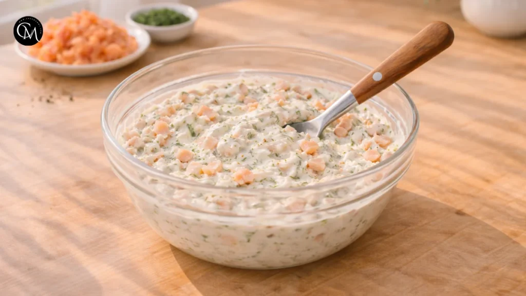 Fold most of the chopped smoked salmon into the creamy mixture, leaving a small amount aside for topping if desired. Stir gently so the salmon stays in small visible pieces rather than turning into a paste.