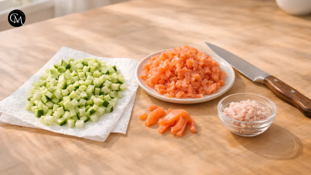 This step matters more than it seems. A watery cucumber can thin the layers and make the verrines look messy after a short time in the fridge. Once diced, place the cucumber on paper towels for a few minutes to absorb extra moisture.