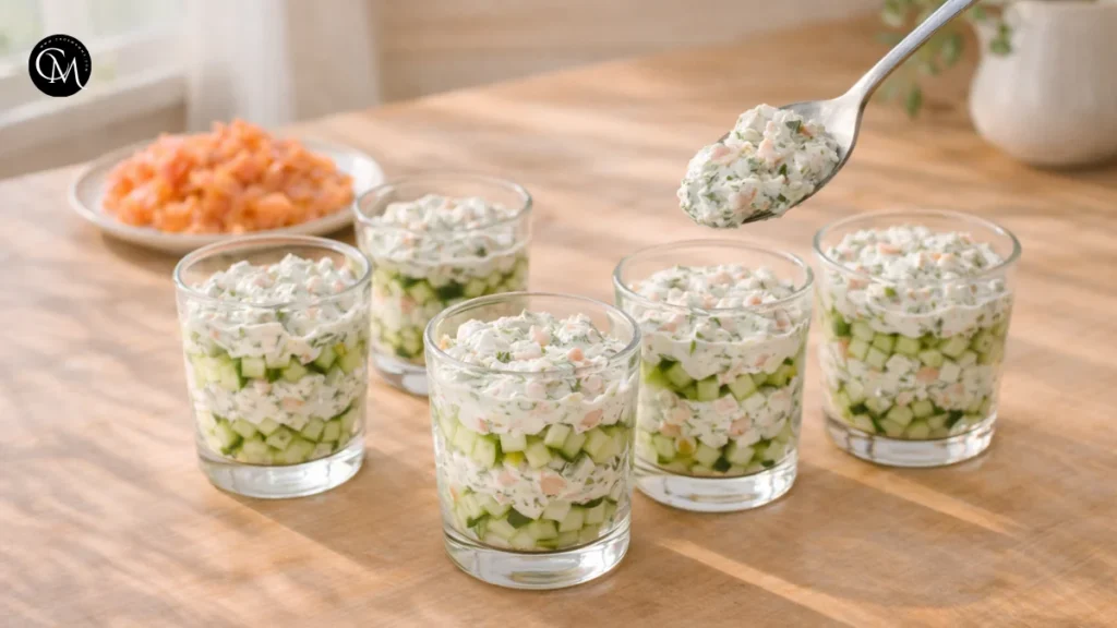 For children or older adults who prefer milder flavors, reduce the shallot and use a softer herb balance. For dieters, serve smaller portions in mini glasses and focus on the freshness of the cucumber and herbs rather than making the filling too rich.