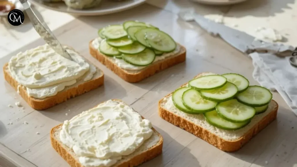 Spread the cream cheese mixture generously on each bread slice. Arrange the cucumber slices in an even layer on half of the slices. Cover the prepared slice with the remaining slice to seal it.