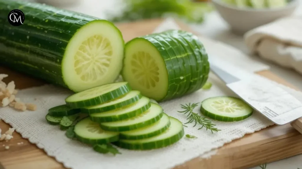 Cut the cucumber into thin slices using a vegetable slicer or a sharp knife. Pat dry with a paper towel to prevent the cucumber from getting soggy.