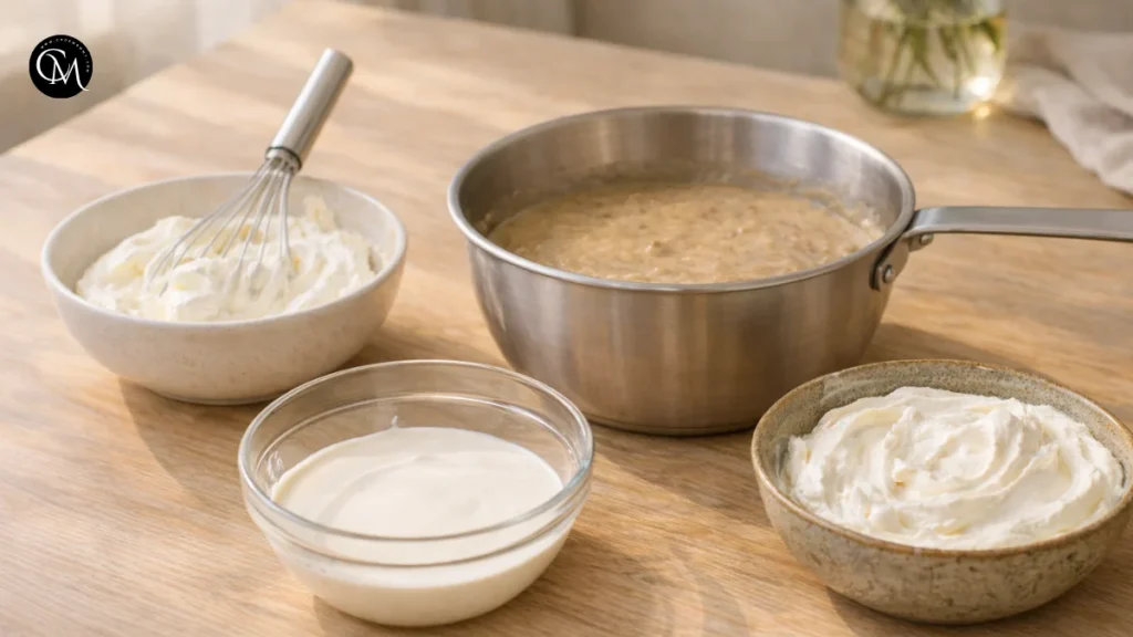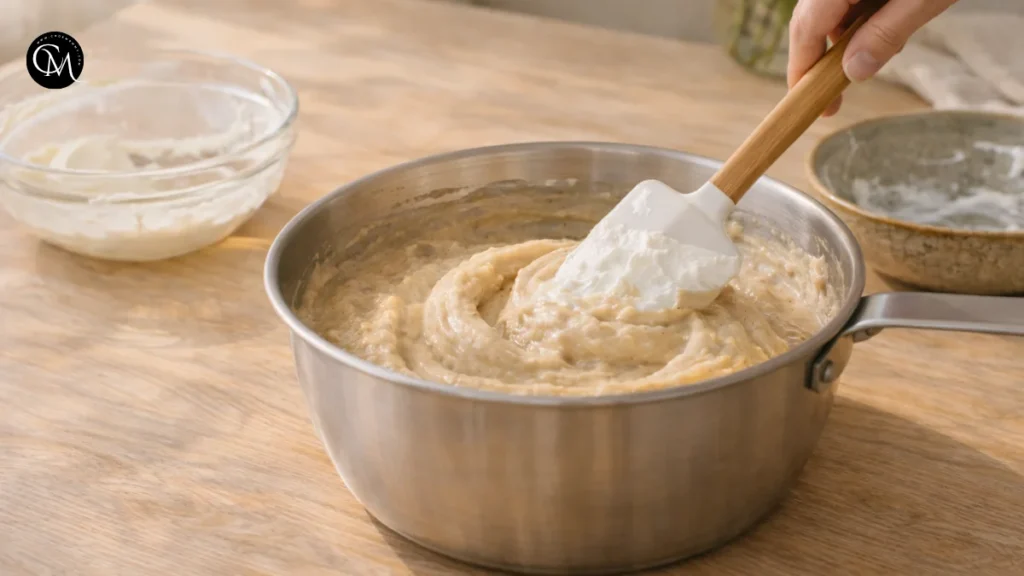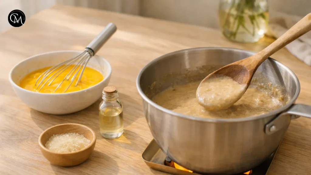 Cook gently over low heat, stirring continuously, until the mixture slightly thickens and coats the back of a spoon. Do not boil it. This step matters because the yolks add body and richness, while gentle heat helps everything emulsify into a stable, creamy base.