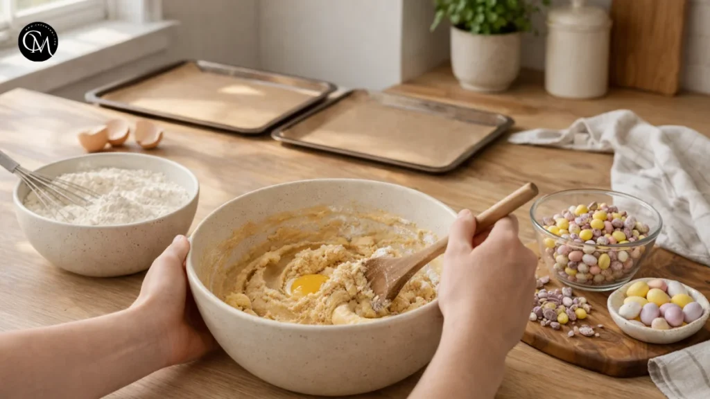 This step does more than combine ingredients. Creaming introduces air, which gives the cookies lift and a softer interior. Brown sugar brings moisture and chewiness, while white sugar helps the edges crisp. That balance is especially important in Egg Cadbury Cookies because the candy pieces already bring extra sweetness and crunch.