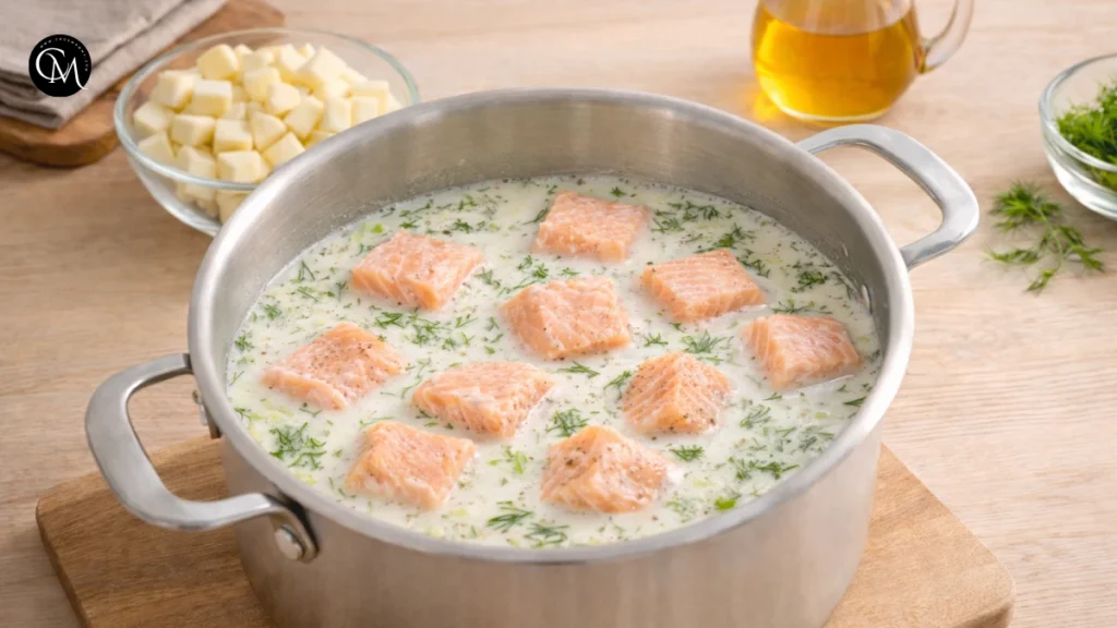 Cut the salmon into large chunks and gently place them into the pot. Cook for 3–4 minutes, just until the fish turns opaque and flakes easily.
