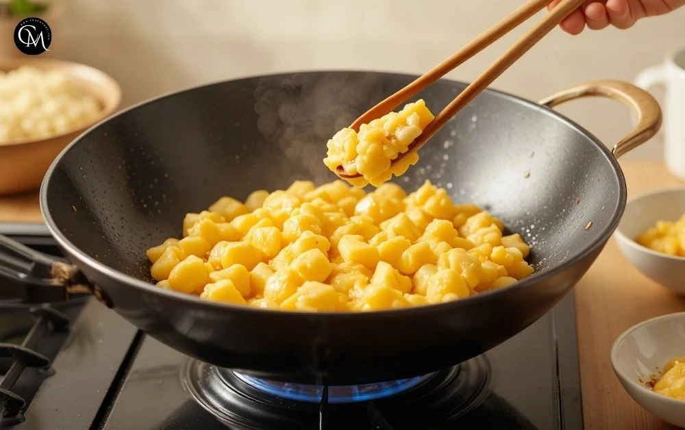 Heat one tablespoon of sesame oil in a large wok or skillet over medium-high heat. Pour in the beaten eggs and scramble gently until just set. Remove from the pan and set aside they’ll be reintroduced later to add texture and richness.