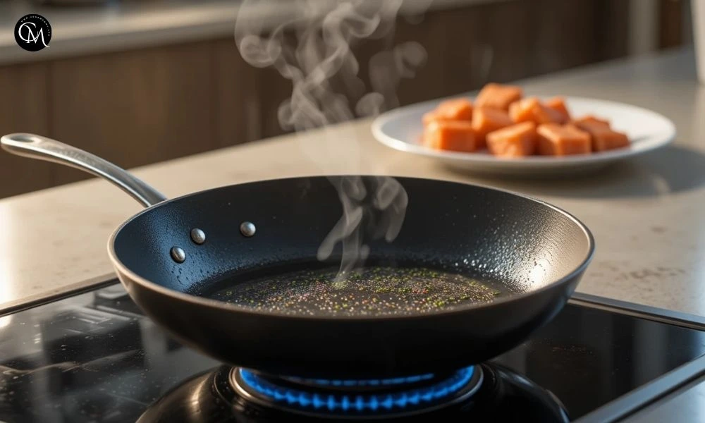 Preheat a nonstick skillet over medium-high heat. Add a small amount of oil and wait until it shimmers before adding the salmon. This ensures a quick, even sear.