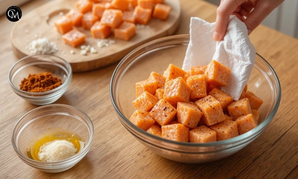Pat the salmon cubes dry with a paper towel to remove excess moisture dryness is key to crispiness. Season with salt, pepper, paprika, and minced garlic. Drizzle with olive oil or melted butter and toss until evenly coated.
