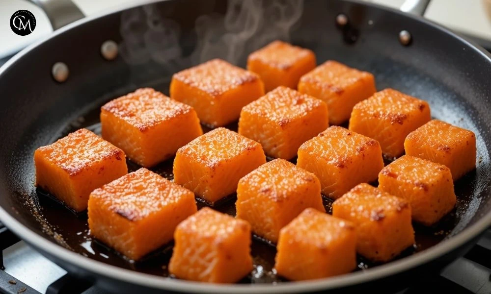 Place the salmon cubes in a single layer, leaving space between them. Sear each side for 2–3 minutes until golden and crisp. Resist the urge to flip too early letting the crust form naturally gives that perfect crunch.