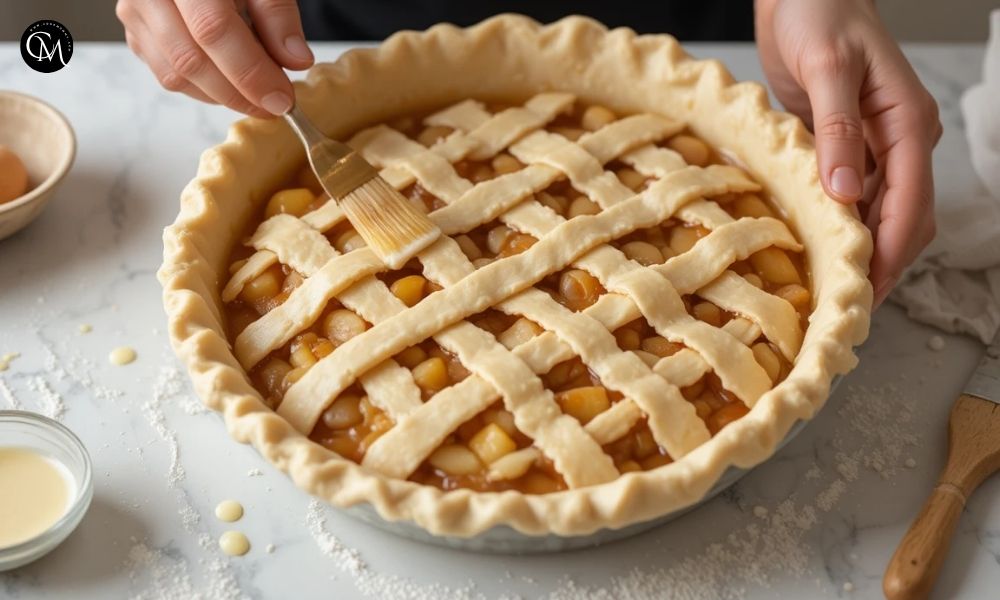 Spread the apple filling evenly inside the crust, then cover with a second crust or lattice. Seal edges using warm hands or a fork and brush the surface with egg wash.