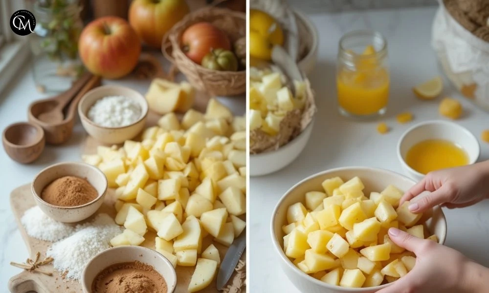 Peel, core, and thinly slice the apples for even cooking. Combine with cinnamon, sugar, lemon juice, vanilla, and starch, then toss gently.