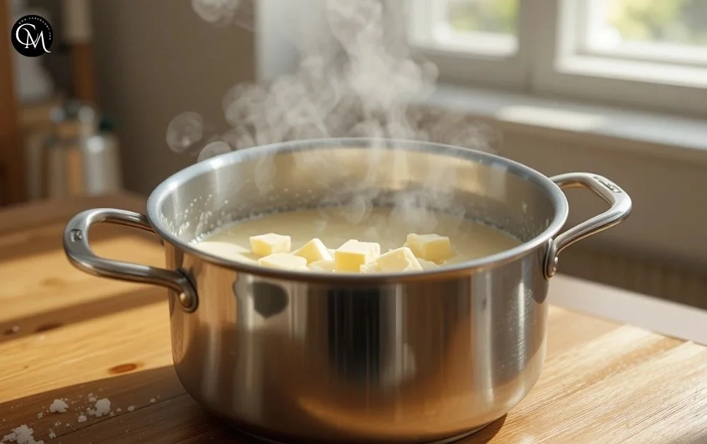 In a saucepan, combine water, milk, butter, sugar, and salt. Bring to a gentle boil. This helps emulsify the fat and liquid, setting the foundation for a smooth, stable dough.