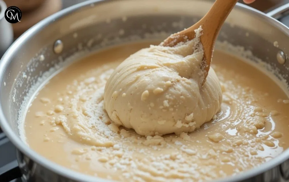 Add the gluten-free flour blend all at once. Stir vigorously until the mixture forms a smooth ball that pulls away from the sides of the pan. This process, known as gelatinization, pre-cooks the starches for better structure and texture.