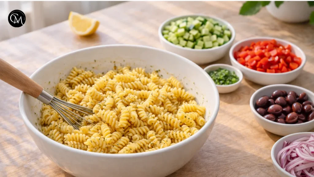This step is where the flavor foundation is created. Dijon helps the dressing emulsify, which means the oil and acid stay blended longer and coat the pasta more evenly. Lemon juice brightens the flavor, while oregano gives that classic Greek-inspired character. The garlic should be finely grated or minced very well so it disappears into the dressing instead of hitting you in one sharp bite.